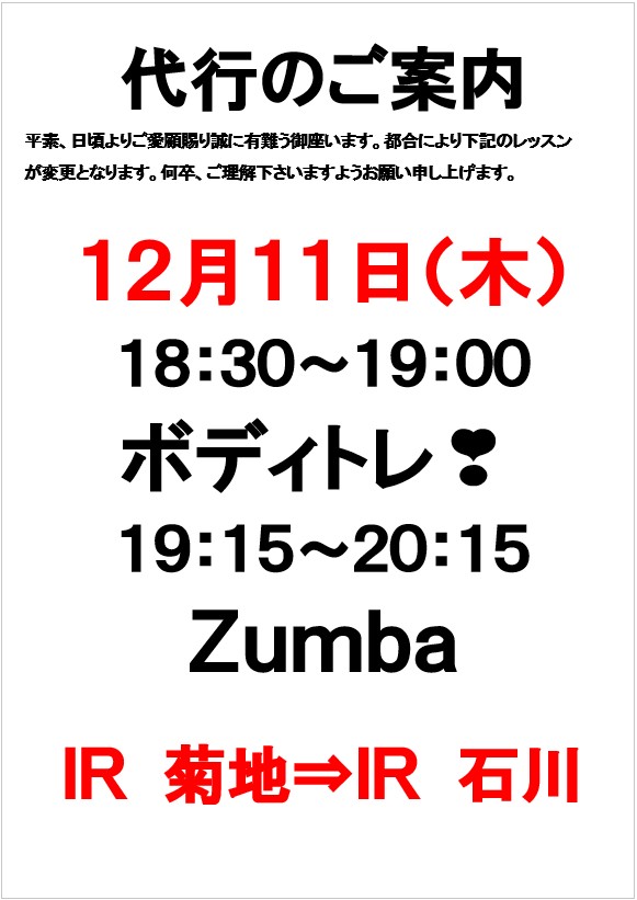 IR都合により下記レッスンが代行となります。